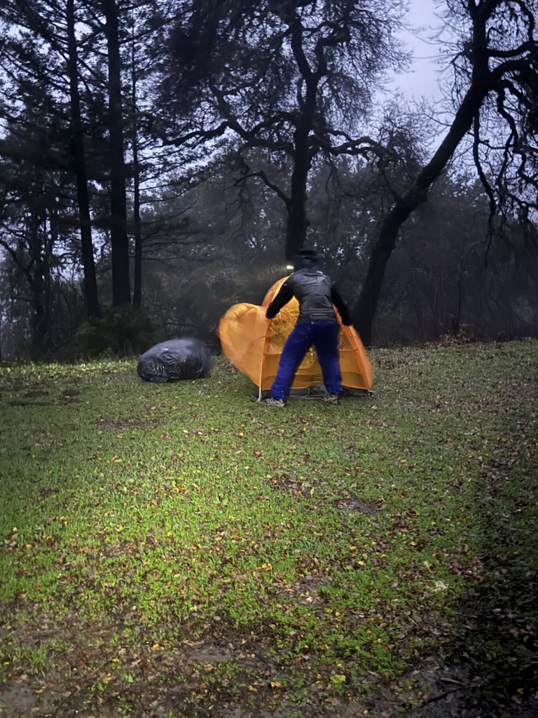 What began as a drizzle turned into steady rain just as tents were being set up for the night.